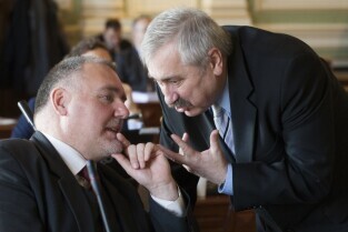 Gdańsk, Nowy Ratusz. Grudniowa sesja Rady Miasta Gdańska, podczas której m.in. uchwalony został budżet miasta w 2014 r. Nz. Radni Miasta Gdańska Jaromir Falandysz (po lewej) i Kazimierz Koralewski