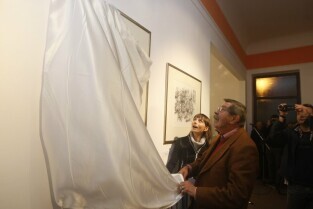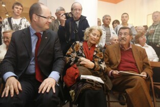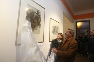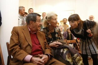 Gdańsk. Festiwal Grassomania z okazji 50. rocznicy wydania Blaszanego Bębęnka i 30. rocznicy jej polskiego przekładu. Otwarcie Gdańskiej Galerii Güntera Grassa (4g) na rogu ulic Szerokiej i Grobla I z udziałem autora powieści. Nz. Gunter Grass z żoną Ute, po prawej Dyrektor Galerii Iwona Bigos
