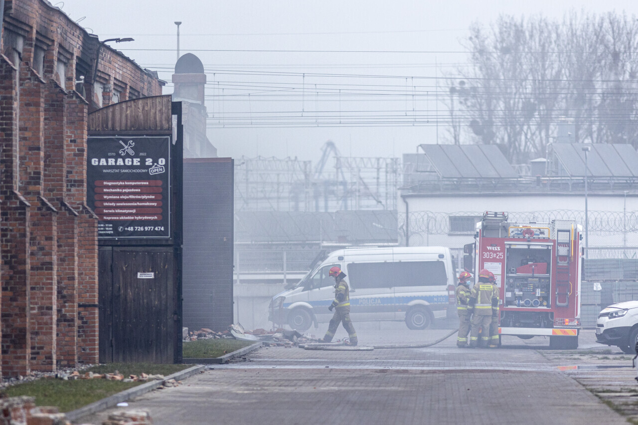 Gdańsk. Strażacy dogaszają ostatnie skupiska ognia w hiostorycznej hali Zakładów Naprawczych Taboru Kolejowego.