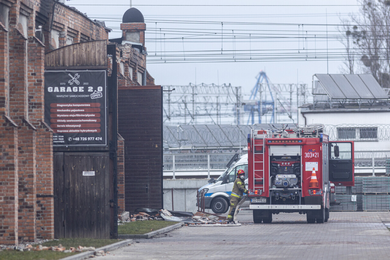Gdańsk. Strażacy dogaszają ostatnie skupiska ognia w hiostorycznej hali Zakładów Naprawczych Taboru Kolejowego.