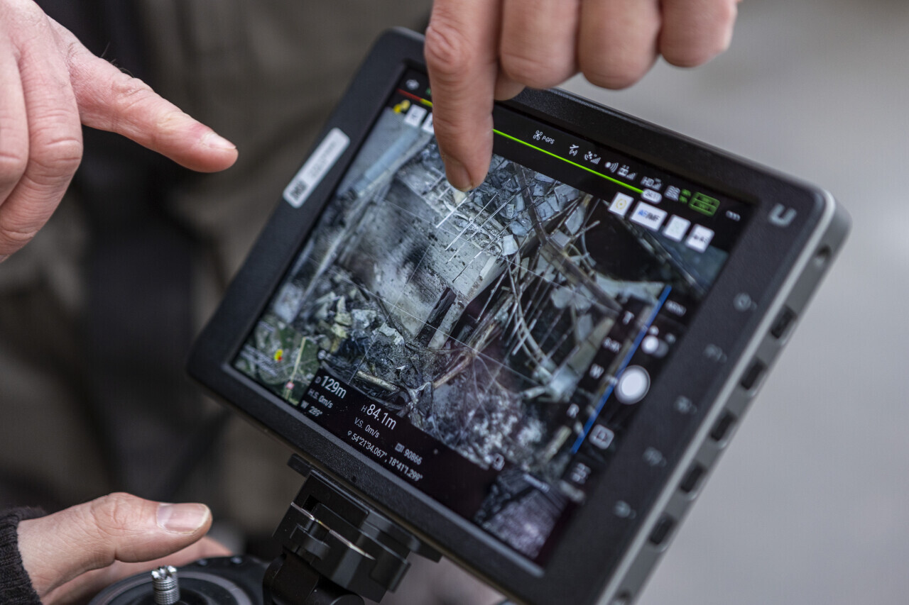 Gdańsk. Strażacy dogaszają ostatnie skupiska ognia w hiostorycznej hali Zakładów Naprawczych Taboru Kolejowego. Nz. Strażacy sprawdzają stan pogorzeliska za pomocą drona