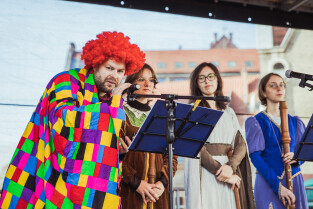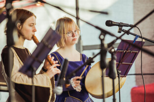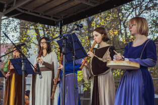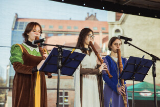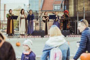 Gdańsk. Halloween i Święto Ulicy Ogarnej. Nz. Występ zestęp zespołu muzyki dawnej Sorelle pod kierunkiem Magdaleny Warżawy, z Pałacu Młodzieży w Gdańsku