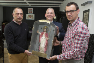 Urząd Miejski w Gdańsku. Przekazanie władzom Gdańska przez pracowników OHL figury Świętej Barbary, która chroniła pracowników budujących tunel pod Martwą Wisłą. Nz. od lewej: Alexey Pryadko (był szefem zespołu obsługującego maszynę TBM), Z-ca Prezydenta Gdańska Andrzej Bojanowski, Tomasz Sroka (pracował jako szef zaopatrzenia budowy tunelu)