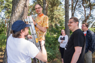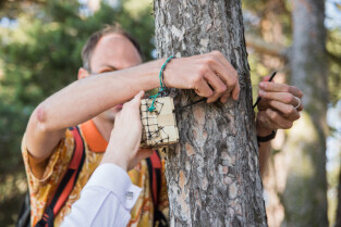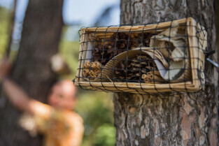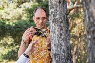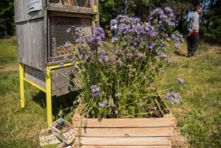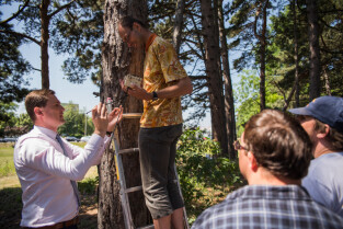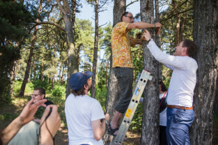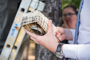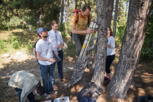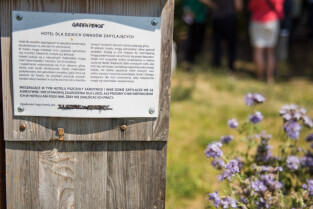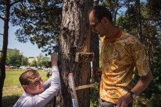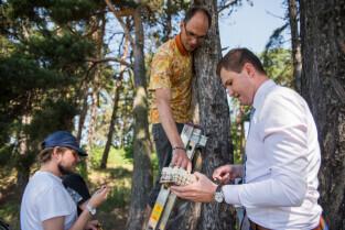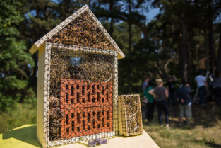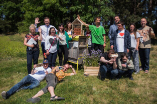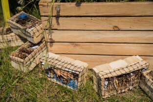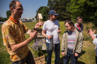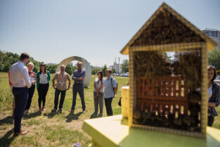 Gdańsk, Park Regana. Hoteliki dla pszczół zamontowali uczestnicy Warsztatów Terapii Zajęciowej wraz z Piotrem Grzelakiem zastępcą prezydenta Gdańska
