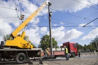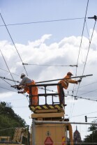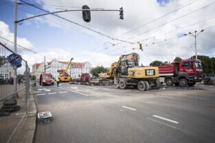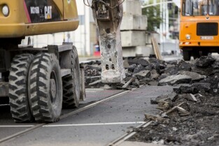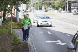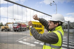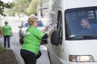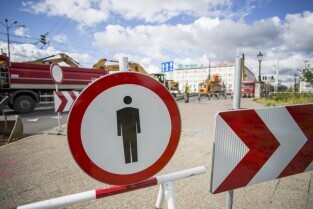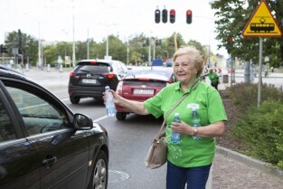 Gdańsk Śródmieście. Zamknięty dla ruchu kołowego wiadukt nad torami kolejowymi w ciągu ul. Hucisko. Przebudowa obiektu jest związana z rozpoczęciem prac przy budowie Forum Gdańsk. Nz. wolontariusze rozdają wodę. Na etykietach butelek znajdują się informacje poświęcone przebudowie