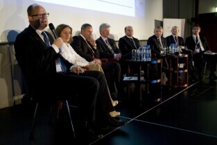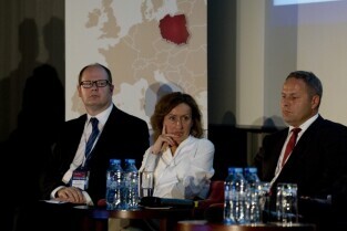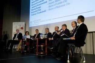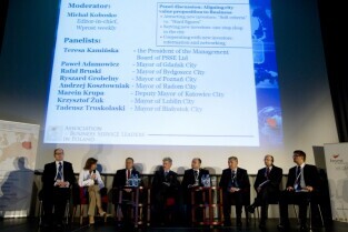 Sopot, Hotel Sheraton. III Konferencja ABSL. Sektor Nowoczesnych Usług Biznesowych w Polsce. Panel dyskusyjny pt. "Dostosowywanie Oferty Polskich Miast do Aktualnych Potrzeb Biznesu". Nz. od lewej: Prezydent Gdańska Paweł Adamowicz, Prezes Pomorskiej Strefy Ekonomicznej Teresa Kamińska, Prezydent Bydgoszczy Rafał Bruski, Prezydent Poznania Ryszard Grobelny, Prezydent Radomia Andrzej Kosztowniak, Prezydent Białegostoku Tadeusz Truskolaski, Prezydent Lublina Krzysztof Żuk, Wiceprezydent Katowic Marcin Krupa