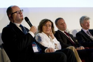 Sopot, Hotel Sheraton. III Konferencja ABSL. Sektor Nowoczesnych Usług Biznesowych w Polsce. Panel dyskusyjny pt. "Dostosowywanie Oferty Polskich Miast do Aktualnych Potrzeb Biznesu". Nz. od lewej: Prezydent Gdańska Paweł Adamowicz, Prezes Pomorskiej Strefy Ekonomicznej Teresa Kamińska, Prezydent Bydgoszczy Rafał Bruski, Prezydent Poznania Ryszard Grobelny