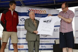 III Maraton Sierpniowy im. Lecha Wałęsy - zawody wrotkarskie o zasięgu międzynarodowym, wchodząca w skład Pucharu Świata. Trasa maratonu biegła wokół PGE Areny oraz ulicami: Żaglową i Marynarki Polskiej. Nz. były Prezydent RP Lech Wałęsa i Prezydent Gdańska Paweł Adamowicz prezentują podpisaną przez siebie pamiątkową koszulkę. Po lewej Gdański Oficer Rowerowy Remigiusz Kiltiński