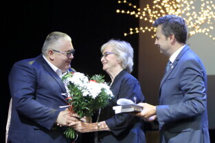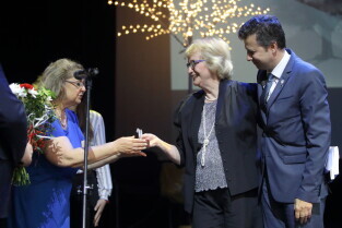 Gdańsk, Teatr Szekspirowski. IV Międzynarodowy Zjazd Szkół i Placówek im. Ireny Sendlerowej. Nz. Wiceprezydent Gdańska Piotr Kowalczuk, Relli Robinson, pisarka, która jako jedyna z rodziny przeżyła getto warszawskie i Rzecznik Praw Dziecka Marek Michalak.