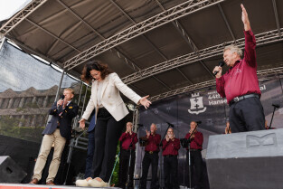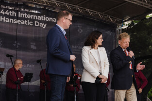 Gdańsk, Targ Węglowy. Inauguracja Jarmarku Hanzeatyckiego. Gości przywitała prezydent Gdańska Aleksandra Dulkiewicz, Burmistrz Lubeki Jan Lindenau oraz Jacek Bendykowski z Fundacji Gdańskiej