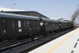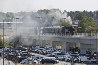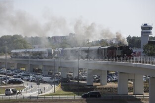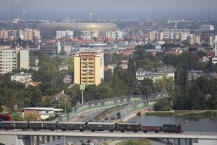 Inauguracja nowej linii Pomorskiej Kolei Metropolitalnej (PKM). Przejazd pociągu retro po wiadukcie nad ul. Słowackiego w Gdańsku, po lewej przystanek PKM Niedźwiednik. Widok z osiedla o tej samej nazwie