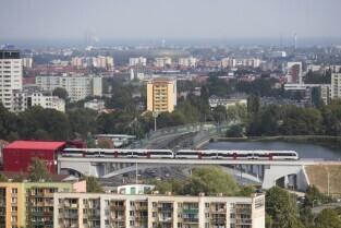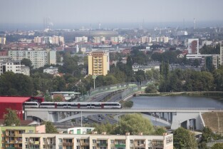 Inauguracja nowej linii Pomorskiej Kolei Metropolitalnej (PKM). Przejazd szynobusu po wiadukcie nad ul. Słowackiego w Gdańsku, po lewej przystanek PKM Niedźwiednik. Widok z osiedla o tej samej nazwie