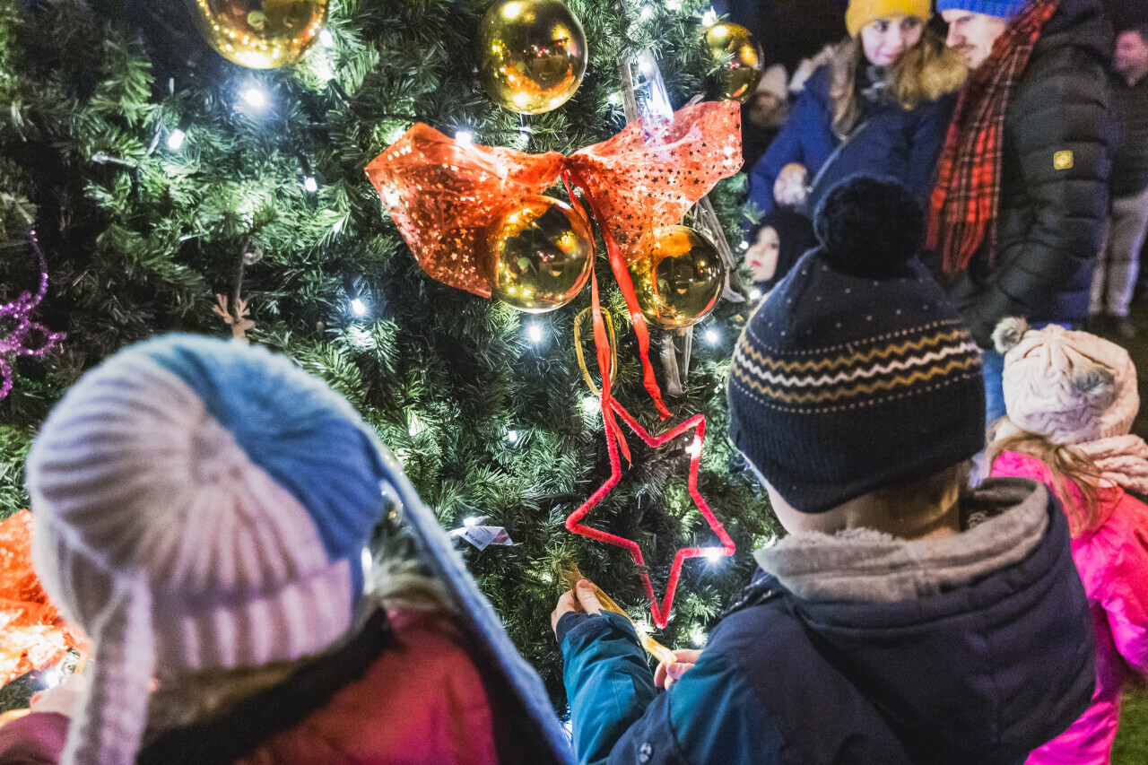 Gdańsk, ul. Damroki. Inauguracja dzielnicowej choinki na Jasieniu z udziałem wiceprezydenta Piotra Grzelaka