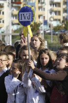 Inauguracja gdańskiego roku oraz otwarcie nowej Szkoły Podstawowej nr 12, najnowocześniejszej w Polsce. Nz. Iwona Furmańczuk, dyrektorka SP nr 12 , wraz ze swoimi uczniami trzymającymi symboliczny klucz otwierający rok szkolny.