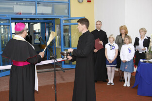 Inauguracja gdańskiego roku oraz otwarcie nowej Szkoły Podstawowej nr 12, najnowocześniejszej w Polsce. Nz. Leszek Sławoj-Głód, Arcybiskup Metropolita Gdański, podczas święcenia szkoły.