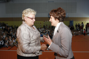Inauguracja gdańskiego roku oraz otwarcie nowej Szkoły Podstawowej nr 12, najnowocześniejszej w Polsce. Nz. Iwona Furmańczuk, dyrektorka SP nr 12, dziękuje Reginie Białousów, Dykterce Wydziału Edukacji UMG, za wkład w powstanie szkoły