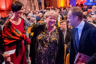 Gdańsk. Inauguracja obchodów Roku Lecha Bądkowskiego w Centrum św. Jana. Nz. (od lewej) Miłosława Kosmulska, Sławina Kosmulska, Donald Tusk