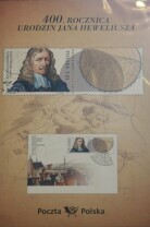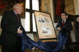Oficjalne rozpoczęcie Roku Jana Heweliusza. Gdańsk, Ratusz Głównego Miasta. Nz. Dyrektor Muzeum Historycznego Miasta Gdańska Adam Koperkiewicz (po lewej) i Bogdan Andrzejewski z Poczty Polskiej odsłaniają okolicznościowy znaczek pocztowy wydany z okazji 400. rocznicy urodzin Jana Heweliusza