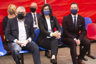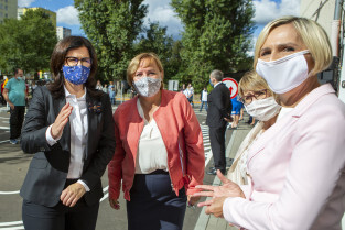 Gdańsk Orunia, Szkoła Podstawowa nr 56. Inauguracja roku szkolnego 2020/2021 połączona z otwarciem miasteczka ruch drogowego. Nz. z-ca prezydenta Gdańska Piotr Kowalczuk, prezydent Gdańska Aleksandra Dulkiewicz, dyrektor Wydziału Rozwoju Społecznego UMG Grzegorz Szczuka