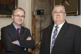 Gdańsk, Ratusz Głównego Miasta. Inauguracyjna sesja Rady Miasta Gdańska, podczas której nowo wybrani radni złożyli ślubowanie oraz wybrali Prezydium Rady. Nz. od lewej Radni: Jerzy Milewski i Piotr Czauderna