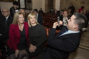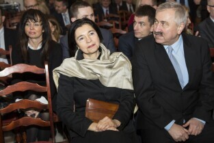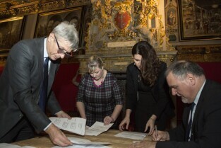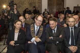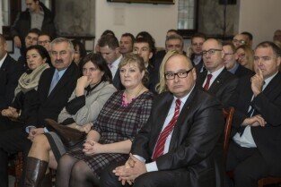 Gdańsk, Ratusz Głównego Miasta. Inauguracyjna sesja Rady Miasta Gdańska, podczas której nowo wybrani radni złożyli ślubowanie oraz wybrali Prezydium Rady. Nz. od lewej: Poseł na Sejm RP Katarzyna Hall, Prezydent Gdańska Paweł Adamowicz, Wicewojewoda Pomorski Michał Owczarczak, Poseł na Sejm RP Jerzy Borowczak