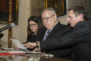 Gdańsk, Ratusz Głównego Miasta. Inauguracyjna sesja Rady Miasta Gdańska, podczas której nowo wybrani radni złożyli ślubowanie oraz wybrali Prezydium Rady. Nz. od lewej: Jan Zarębski, Rektor Uniwersytetu Gdańskiego prof. Bernard Lammek, Rektor Politechniki Gdańskiej prof. Henryk Krawczyk
