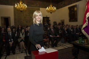 Gdańsk, Ratusz Głównego Miasta. Inauguracyjna sesja Rady Miasta Gdańska, podczas której nowo wybrani radni złożyli ślubowanie oraz wybrali Prezydium Rady. Nz. Emilia Lodzińska
