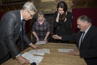 Gdańsk, Ratusz Głównego Miasta. Inauguracyjna sesja Rady Miasta Gdańska, podczas której nowo wybrani radni złożyli ślubowanie oraz wybrali Prezydium Rady. Nz. liczenie głosów podczas wyboru wiceprzewodniczących rady, od lewej Radni: Andrzej Kowalczys, Magdalena Olek, Anna Wirska, Piotr Gierszewski