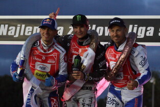 Gdańsk. Stadion żużlowy im. Zbigniewa Podleckiego. Indywidualne Międzynarodowe Mistrzostwa Ekstraligi. Nz. Piotr Pawlicki, Patryk Dudek, Nicki Pedersen.