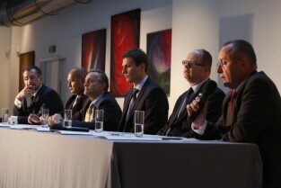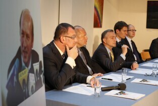 Konferencja prasowa połączona z podpisaniem "Inicjatywy powstania Nagrody im. Macieja Płażyńskiego dla dziennikarzy i mediów służących Polonii". Gdynia, Muzeum Miasta Gdyni. Nz. od lewej: Przewodniczący Rady Press Club Polska Jarosław Włodarczyk, W-ce Marszałek Woj. Pomorskiego Wiesław Byczkowski, Prezydent Gdyni Wojciech Szczurek, syn Macieja Płażyńskiego Jakub Płażyński, Prezydent Gdańska Paweł Adamowicz