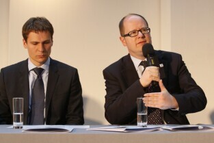 Konferencja prasowa połączona z podpisaniem "Inicjatywy powstania Nagrody im. Macieja Płażyńskiego dla dziennikarzy i mediów służących Polonii". Gdynia, Muzeum Miasta Gdyni. Nz. od lewej: syn Macieja Płażyńskiego Jakub Płażyński i Prezydent Gdańska Paweł Adamowicz
