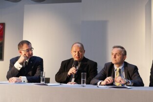 Konferencja prasowa połączona z podpisaniem "Inicjatywy powstania Nagrody im. Macieja Płażyńskiego dla dziennikarzy i mediów służących Polonii". Gdynia, Muzeum Miasta Gdyni. Nz. od lewej: Przewodniczący Rady Press Club Polska Jarosław Włodarczyk, W-ce Marszałek Woj. Pomorskiego Wiesław Byczkowski, Prezydent Gdyni Wojciech Szczurek