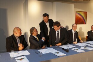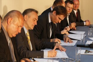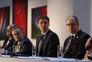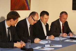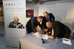 Konferencja prasowa połączona z podpisaniem "Inicjatywy powstania Nagrody im. Macieja Płażyńskiego dla dziennikarzy i mediów służących Polonii". Gdynia, Muzeum Miasta Gdyni. Nz. od prawej: Prezydent Gdańska Paweł Adamowicz, syn Macieja Płażyńskiego Jakub Płażyński, Prezydent Gdyni Wojciech Szczurek, W-ce Marszałek Woj. Pomorskiego Wiesław Byczkowski