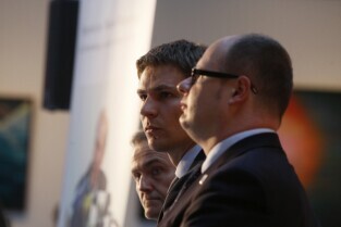 Konferencja prasowa połączona z podpisaniem "Inicjatywy powstania Nagrody im. Macieja Płażyńskiego dla dziennikarzy i mediów służących Polonii". Gdynia, Muzeum Miasta Gdyni. Nz. od lewej: syn Macieja Płażyńskiego Jakub Płażyński, Prezydent Gdańska Paweł Adamowicz, Prezydent Sopotu Jacek Karnowski