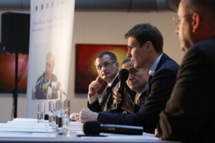 Konferencja prasowa połączona z podpisaniem "Inicjatywy powstania Nagrody im. Macieja Płażyńskiego dla dziennikarzy i mediów służących Polonii". Gdynia, Muzeum Miasta Gdyni. Nz. od lewej: syn Macieja Płażyńskiego Jakub Płażyński, Prezydent Gdańska Paweł Adamowicz, Prezydent Sopotu Jacek Karnowski, Dyrektor Fundacji Pomorskiej Maciej Kazienko