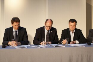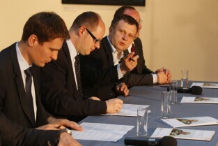 Konferencja prasowa połączona z podpisaniem "Inicjatywy powstania Nagrody im. Macieja Płażyńskiego dla dziennikarzy i mediów służących Polonii". Gdynia, Muzeum Miasta Gdyni. Nz. od prawej: Prezydent Gdańska Paweł Adamowicz, syn Macieja Płażyńskiego Jakub Płażyński, Prezydent Gdyni Wojciech Szczurek