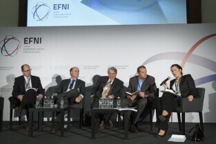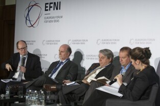 Prezydent Gdańska Paweł Adamowicz (1L) bierze udział w panelu dyskusyjnym pt. "Inteligentne miasta. Wyzwania dla rozwoju Europy" w ramach Europejskiego Forum Nowych Idei. W dyskusji biorą udział również: Joost van Iersel, Jose Luis Angoso (2L), Benjamin R. Barber (3L), Dejan Cvetković (4L). Panel prowadzi Anya Margaret Ogorkiewicz (5L). Sopot, Hotel Sheraton