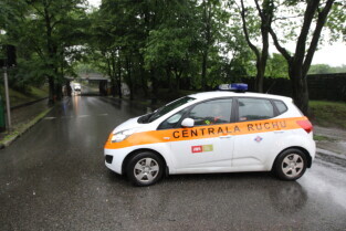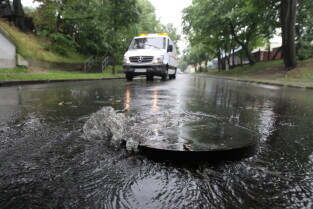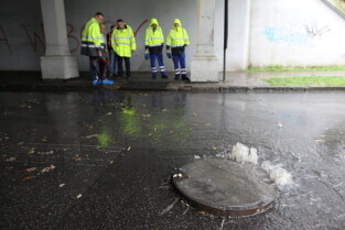 Gdańsk. Intensywne opady deszczu. Studzienka przy Piastowskiej wybija wodę w związku z tym zamknięto przejazd.
