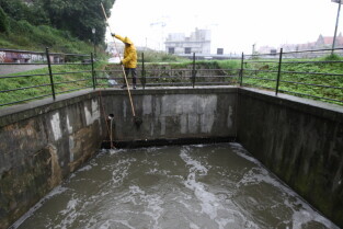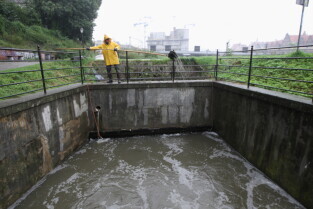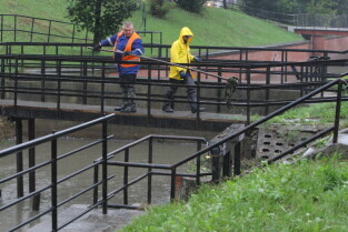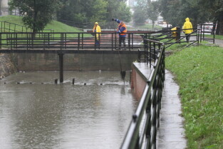 Gdańsk. Intensywne opady deszczu. Nz. Kanał Raduni przy ul. Zaroślak, czyszczenie kraty zrzutowej.