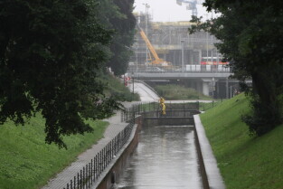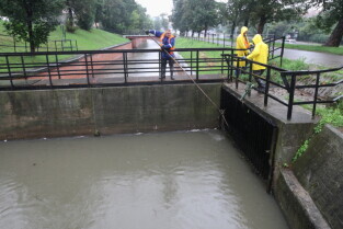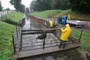 Gdańsk. Intensywne opady deszczu. Nz. Kanał Raduni przy ul. Mennonitów, czyszczenie kraty zrzutowej.