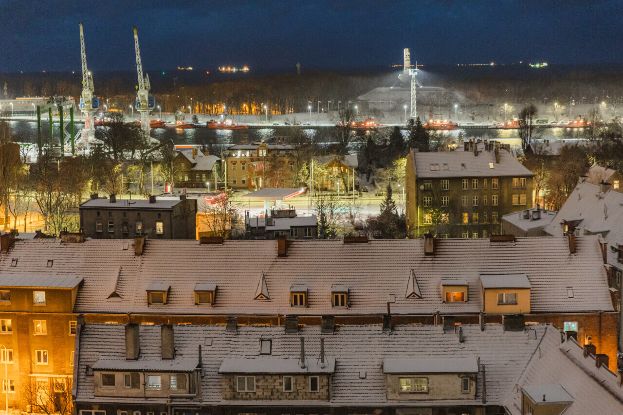 Gdańsk. Intensywne opady śniegu. Nz. dzielnica Nowy Port
