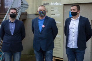 Otwarcie JadłoDzielnicy, pierwszego tego typu miejsca w tej części Gdańska, w którym będzie można pozostawić żywność, której nie uda nam się zjeść. Gdańsk Migowo, kościół parafialny Miłosierdzia Bożego. Nz. od lewej: Przewodniczący Rady Dzielnicy Piecki-Migowo Mateusz Zakrzewski, Zastępca Przewodniczącego Zarządu Dzielnicy Piecki-Migowo Grzegorz Giżewski, właściciel restauracji Fresco Lunch & Restaurant Morena Daniel Sołowiej
