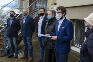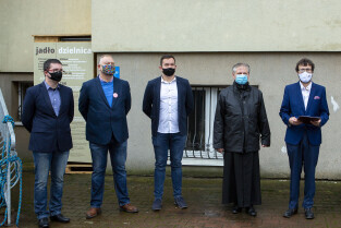 Otwarcie JadłoDzielnicy, pierwszego tego typu miejsca w tej części Gdańska, w którym będzie można pozostawić żywność, której nie uda nam się zjeść. Gdańsk Migowo, kościół parafialny Miłosierdzia Bożego. Nz. od lewej: Przewodniczący Rady Dzielnicy Piecki-Migowo Mateusz Zakrzewski, Zastępca Przewodniczącego Zarządu Dzielnicy Piecki-Migowo Grzegorz Giżewski, właściciel restauracji Fresco Lunch & Restaurant Morena Daniel Sołowiej, proboszcz parafii pw. Miłosierdzia Bożego Krzysztof Nowak, Radny Miasta Gdańska Przemysław Malak