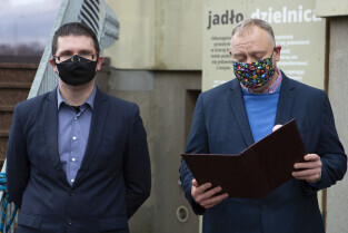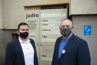 Otwarcie JadłoDzielnicy, pierwszego tego typu miejsca w tej części Gdańska, w którym będzie można pozostawić żywność, której nie uda nam się zjeść. Gdańsk Migowo, kościół parafialny Miłosierdzia Bożego. Nz. od lewej: Przewodniczący Rady Dzielnicy Piecki-Migowo Mateusz Zakrzewski, Zastępca Przewodniczącego Zarządu Dzielnicy Piecki-Migowo Grzegorz Giżewski