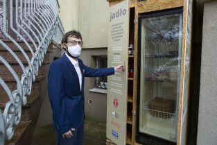 Otwarcie JadłoDzielnicy, pierwszego tego typu miejsca w tej części Gdańska, w którym będzie można pozostawić żywność, której nie uda nam się zjeść. Gdańsk Migowo, kościół parafialny Miłosierdzia Bożego. Nz. Radny Miasta Gdańska Przemysław Malak