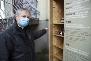 Otwarcie JadłoDzielnicy, pierwszego tego typu miejsca w tej części Gdańska, w którym będzie można pozostawić żywność, której nie uda nam się zjeść. Gdańsk Migowo, kościół parafialny Miłosierdzia Bożego. Nz. proboszcz parafii pw. Miłosierdzia Bożego Krzysztof Nowak
