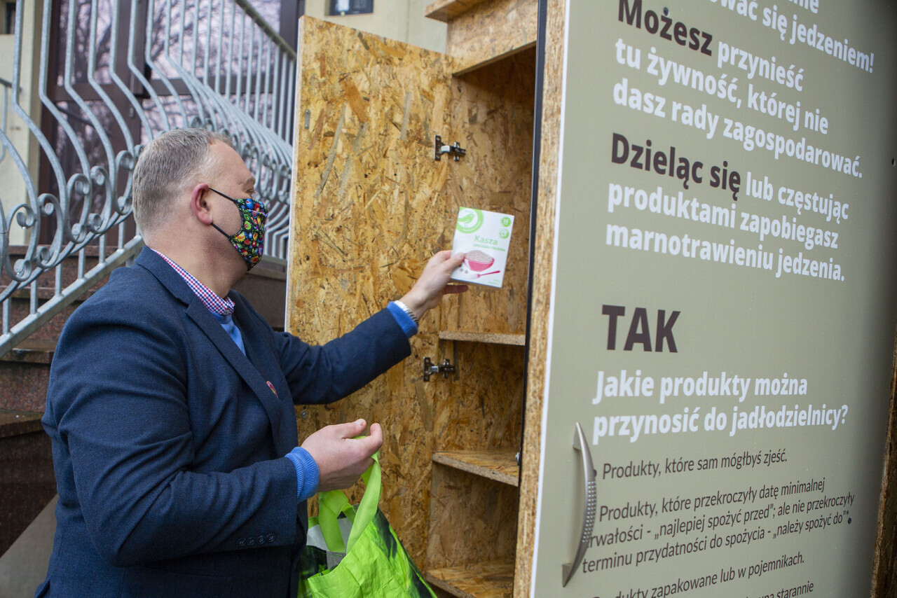 Otwarcie JadłoDzielnicy, pierwszego tego typu miejsca w tej części Gdańska, w którym będzie można pozostawić żywność, której nie uda nam się zjeść. Gdańsk Migowo, kościół parafialny Miłosierdzia Bożego. Nz. Zastępca Przewodniczącego Zarządu Dzielnicy Piecki-Migowo Grzegorz Giżewski