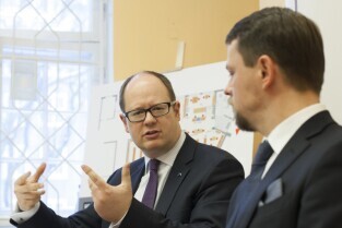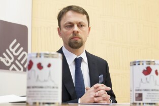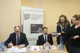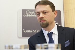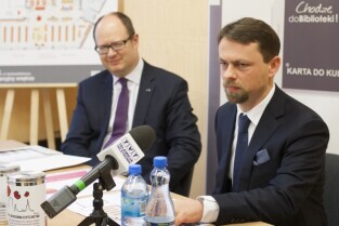 Gdańsk, Biblioteka Pod Żółwiem przy ul. Św. Ducha. Konferencja prasowa z udziałem Prezydenta Gdańska Pawła Adamowicza oraz Dyrektora Wojewódzkiej i Miejskiej Biblioteki Publicznej w Gdańsku Pawła Brauna prezentująca wyniki czytelnictwa za rok 2013 i plany na rok 2014
