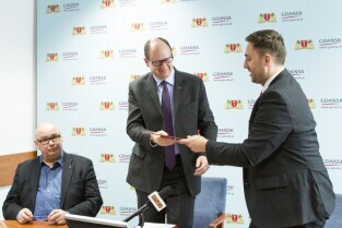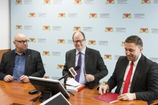 Urząd Miejski w Gdańsku. Spotkanie Zespołu Konsultacyjnego ds. Budżetu Obywatelskiego 2016, podczas którego przedstawiono Prezydentowi Gdańska Pawłowi Adamowiczowi rekomendacje zasad przyszłorocznego budżetu. Nz. od prawej: Radny Miasta Gdańska Piotr Borawski, Prezydent Gdańska Paweł Adamowicz, Radny Miasta Gdańska Grzegorz Strzelczyk