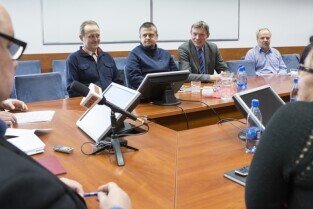 Urząd Miejski w Gdańsku. Spotkanie Zespołu Konsultacyjnego ds. Budżetu Obywatelskiego 2016, podczas którego przedstawiono Prezydentowi Gdańska Pawłowi Adamowiczowi rekomendacje zasad przyszłorocznego budżetu. Nz. od lewej: Andrzej Witkiewicz, Arkadiusz Peisert, Jarosław Szczukowski